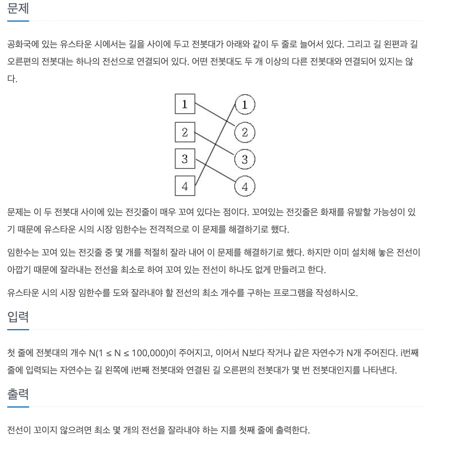 첫 줄에 전봇대의 개수 N(1 ≤ N ≤ 100,000)이 주어지고, 이어서 N보다 작거나 같은 자연수가 N개 주어진다. i번째 줄에 입력되는 자연수는 길 왼쪽에 i번째 전봇대와 연결된 길 오른편의 전봇대가