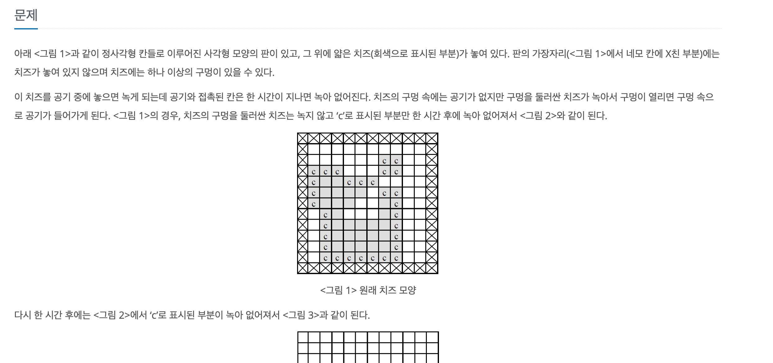 아래 <그림 1>과 같이 정사각형 칸들로 이루어진 사각형 모양의 판이 있고, 그 위에 얇은 치즈(회색으로 표시된 부분)가 놓여 있다. 판의 가장자리(<그림 1>에서 네모 칸에 X친 부분)에는 치즈가 놓
