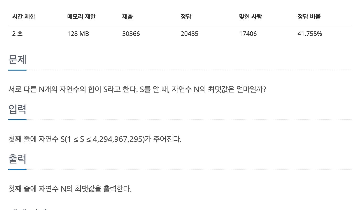 첫째 줄에 자연수 S(1 ≤ S ≤ 4,294,967,295)가 주어진다.