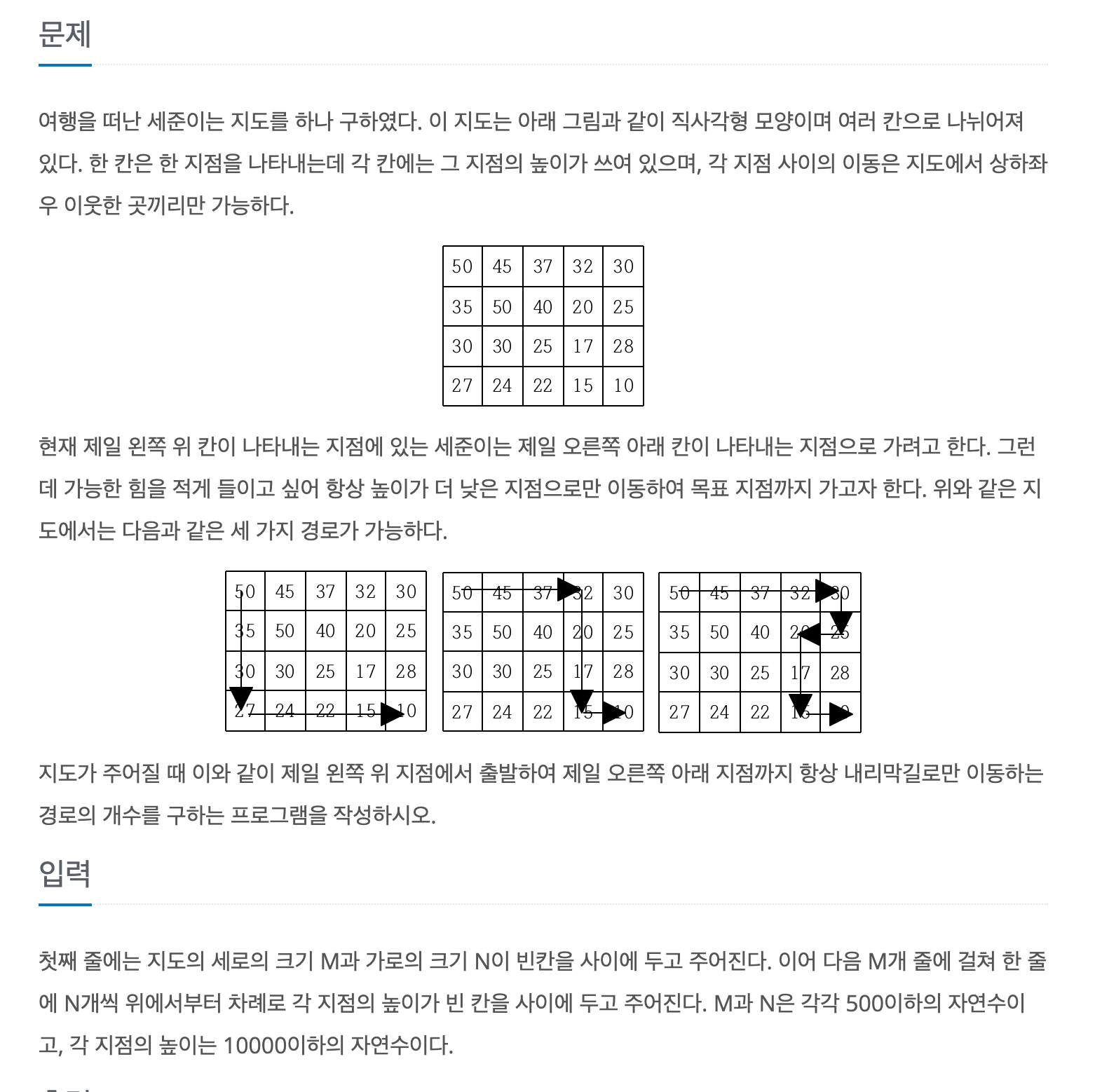 여행을 떠난 세준이는 지도를 하나 구하였다. 이 지도는 아래 그림과 같이 직사각형 모양이며 여러 칸으로 나뉘어져 있다. 한 칸은 한 지점을 나타내는데 각 칸에는 그 지점의 높이가 쓰여 있으