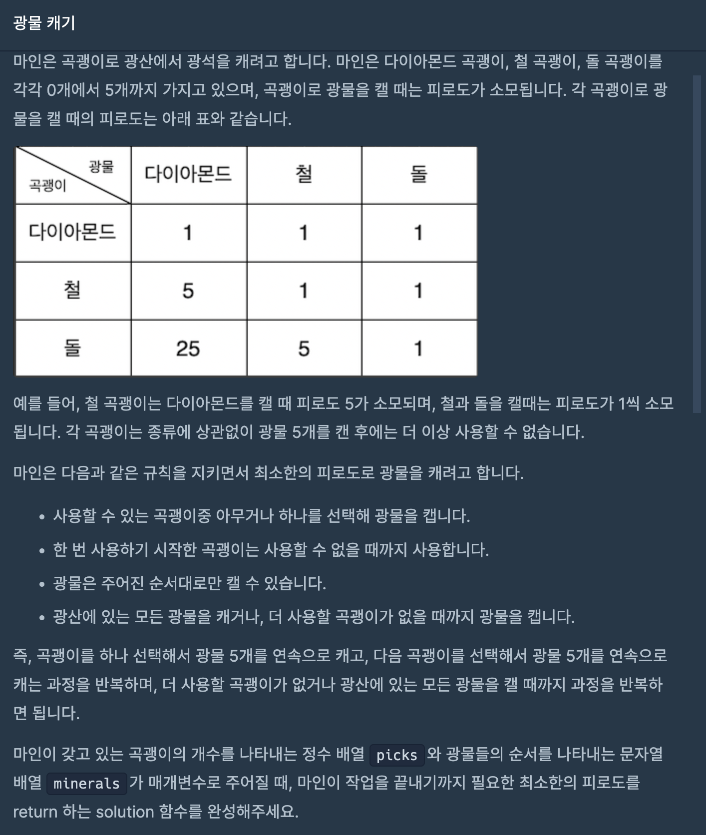 우선 곡괭이는 한 번 집으면 5번을 "무조건" 사용해야 하는데 곡괭이 개수는 광물 *5와 같다. 즉 곡괭이 개수 * 5 가 광물의 개수와 같은지 비교해야 한다.