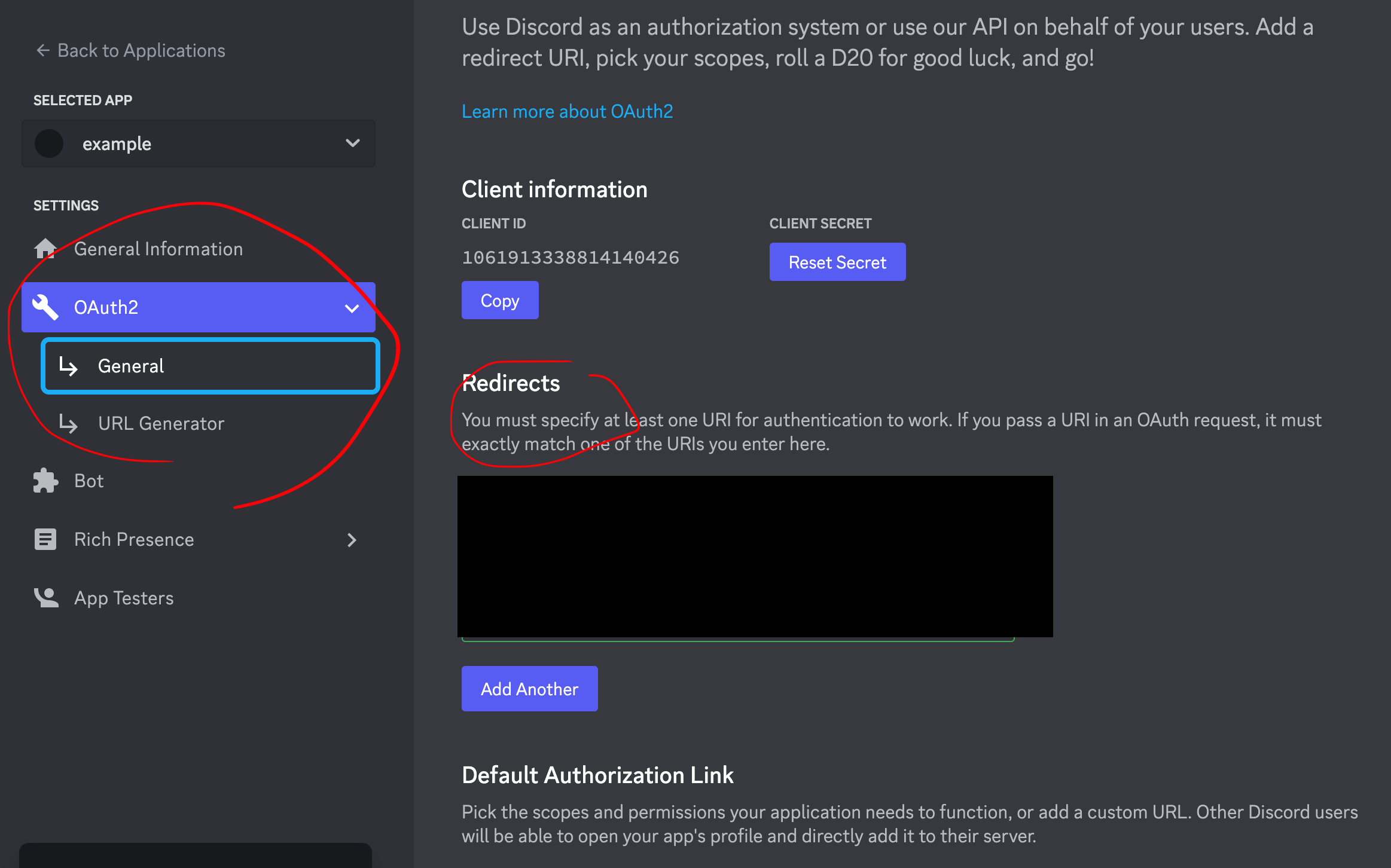 다음으론 그 아래 Redirects에 http://localhost:8000/auth/discord을 추가한다.