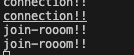 이제 스트릭트 모드를 제거했으면 connection!!과 join-room!!이라는 콘솔이 한 번씩 찍히는 것을 확인할 수 있다.