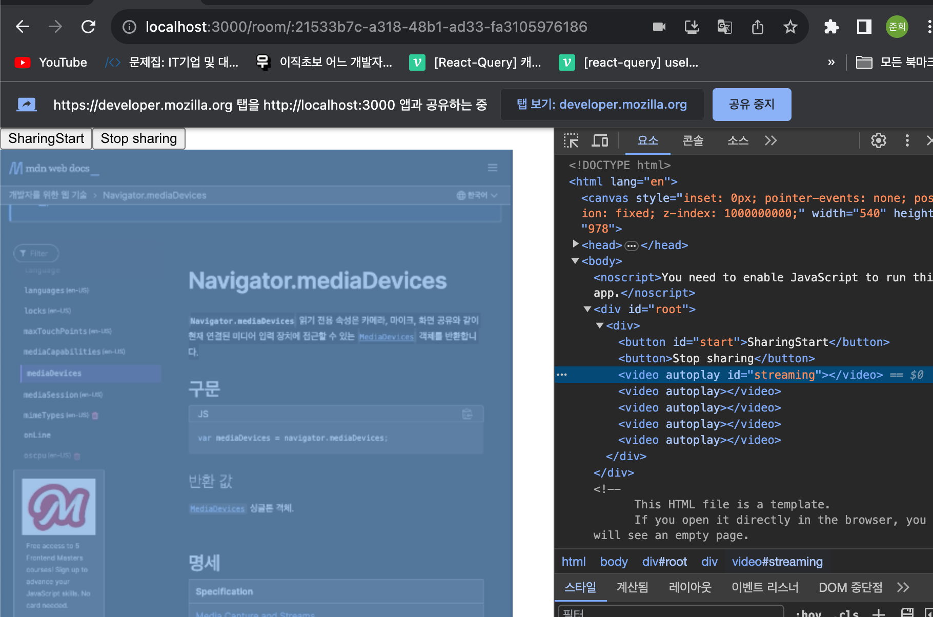 다만 useMedia를 가져오는 화상통화와 달리 스트리밍은 유저의 화면을 보여주는 것이므로 getDisplayMedia를 사용하면 된다.