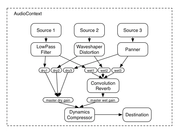 2012년에는 클라이언트측 개발이 더욱 활발해지면서 Web Audio API가 W3C사양의 일부로 도입되었습니다. 이는 자바스크립트 개발자가 오디오 노드를 사용하여 자신만의 오디오 효과를 구성할 수 있게 해주는 획기적인 변화였습니다.