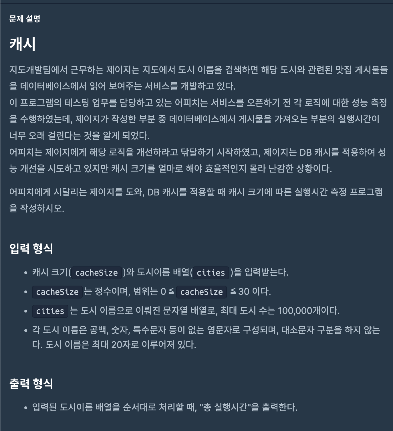 만일 캐시 사이즈가 꽉 찼음에도 arr안에 없을 경우 0번째를 pop하고 append시켜주었다.