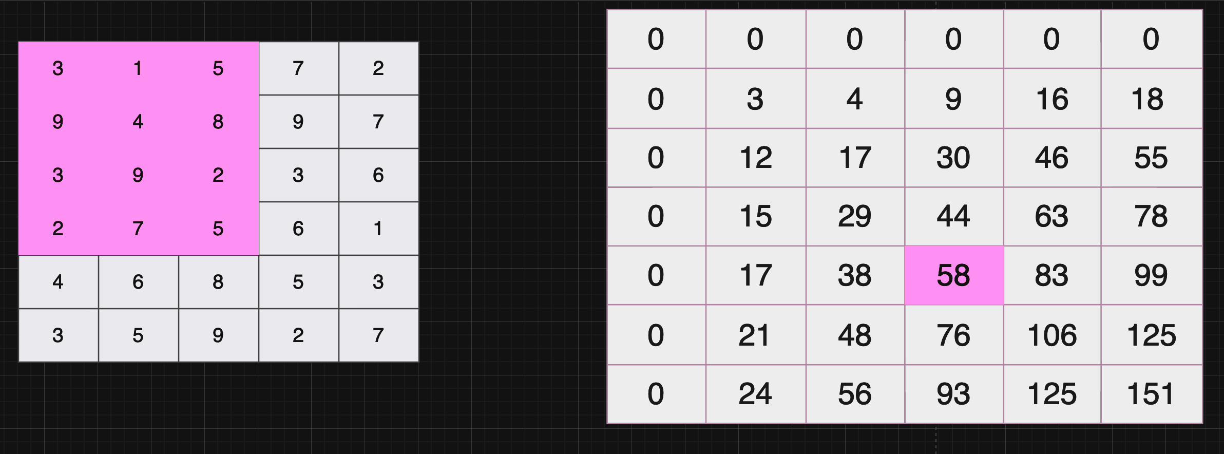 즉 오른쪽 사진의 58이란 값은 왼쪽의 분홍색 영역의 누적합과 같다.