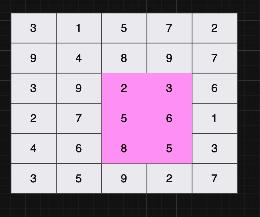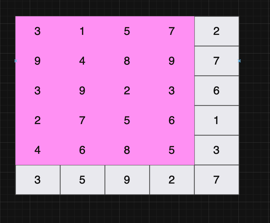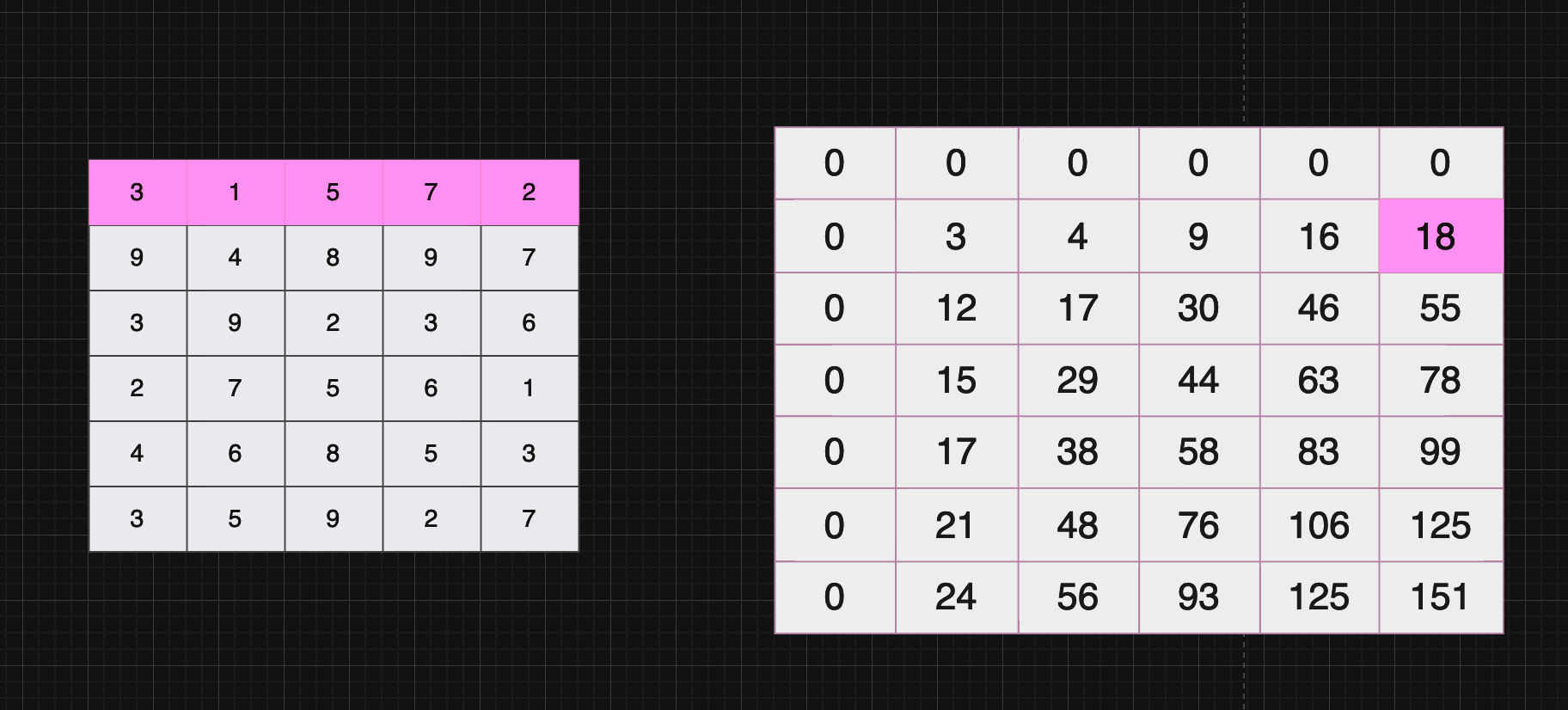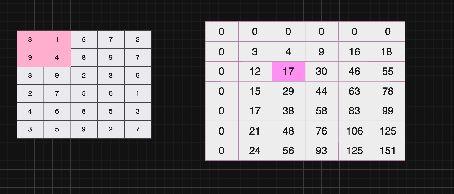 즉, 초록색 영역의 누적합을 구하기 위해선 "5"자리의 누적합을 구한 다음 분홍색 영역의 값을 빼주면 구하고자 하는 누적합을 구할수가 있다.
