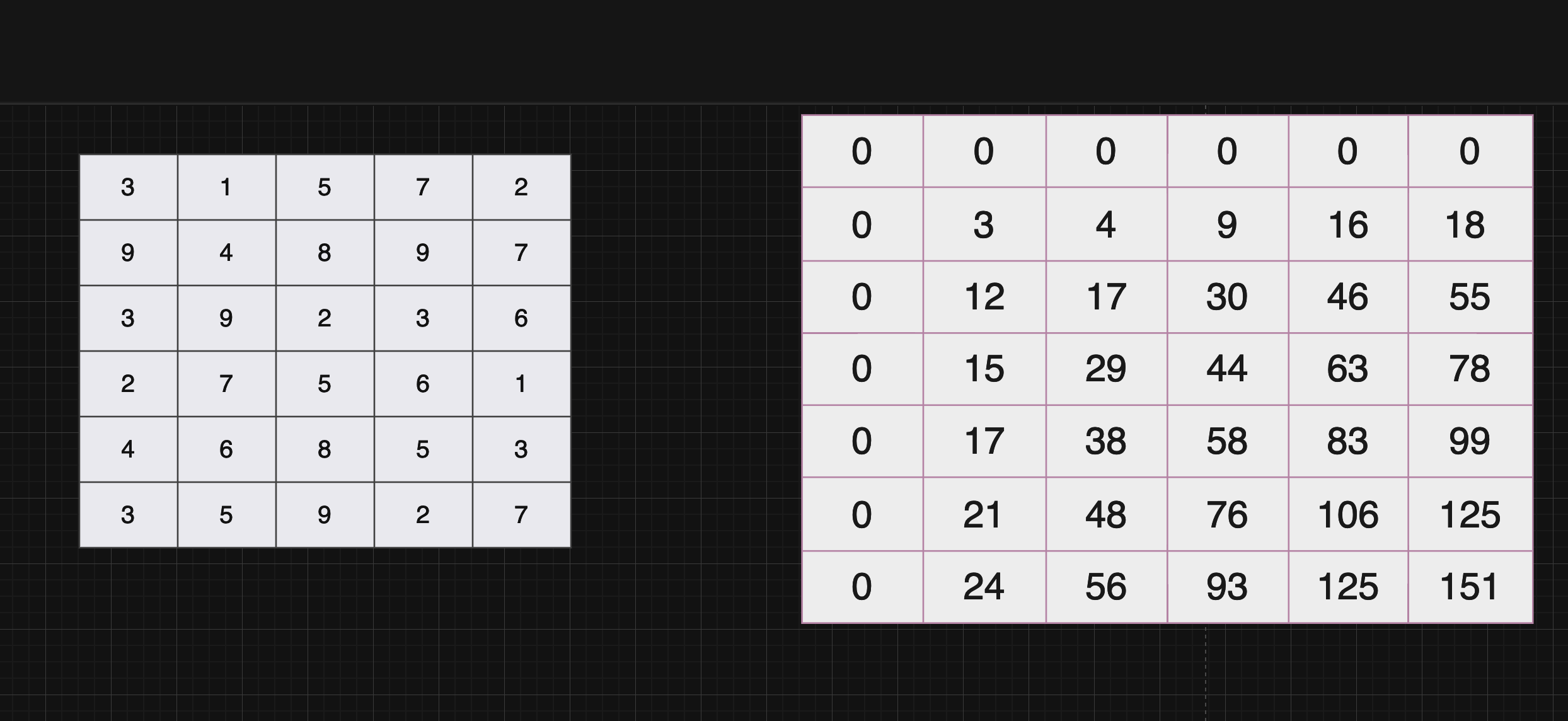 왼쪽의 이차원 배열의 누적합을 계산한 것이 오른쪽의 표이다.