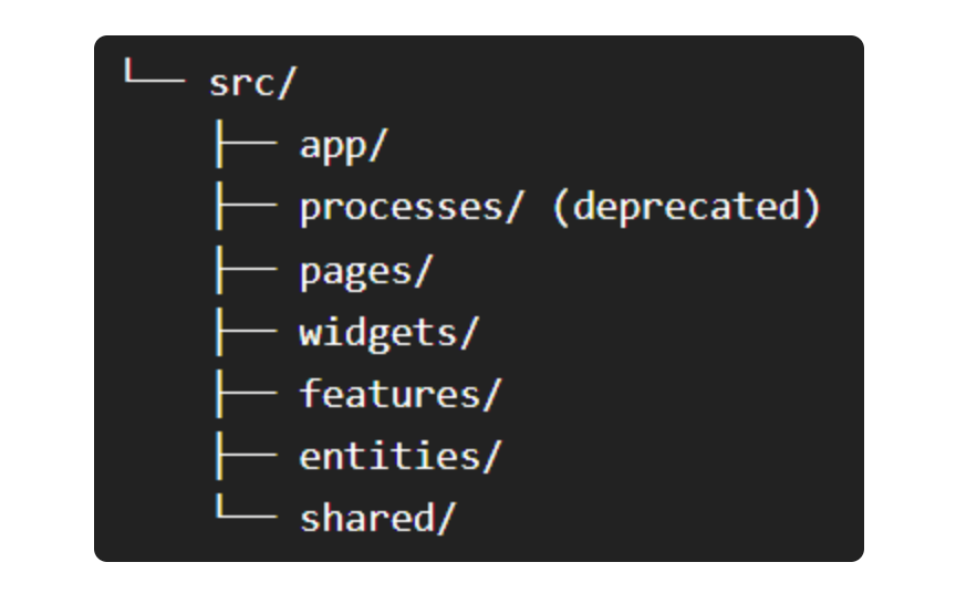 레이어는 최상위 디렉터리이자 애플리케이션 분해의 첫 번째 수준입니다. 레이어 수는 최대 7개로 제한되어 있으며 표준화되어 있지만 일부는 선택 사항입니다. (준희 - 실제로 FSD 공식 문서를 살펴보면 process레이어는 deprecated라고 되어있다. 상황에 따라 넣으면 될 것같다.)
