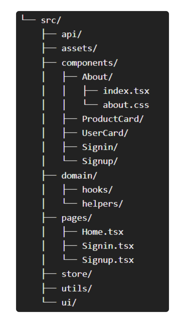 - shared: 이 계층에는 특정 비즈니스 노리에 연결되지 않은 재사용 가능한 구성요소와 유틸리티가 포함되어 있습니다. 여기에는 UI키트, axios구성, 애플리케이션 구성, 비즈니스 로직에 얽매이지 않은 도우미 등이 있습니다.
