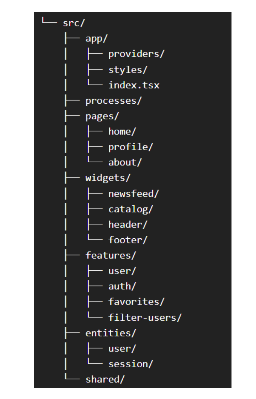 - entities: 이 레이어는 비즈니스 엔티티를 나타냅니다. 이러한 엔티티에는 사용자, 리뷰, 댓글 등이 포함될 수 있다. 이는 선택적 레이어입니다. (준희 - 흔히 컴포넌트 폴더에 있는 컴포넌트들이 담긴 폴더같다. 예를들어 features에서 불러온 데이터를 렌더링하는, todo-list의 예로 들면, featuers는 todo-list 데이터를 불러오고, entities는 그 불러온 데이터를 렌더링하는 파일이 모인 파일이다)