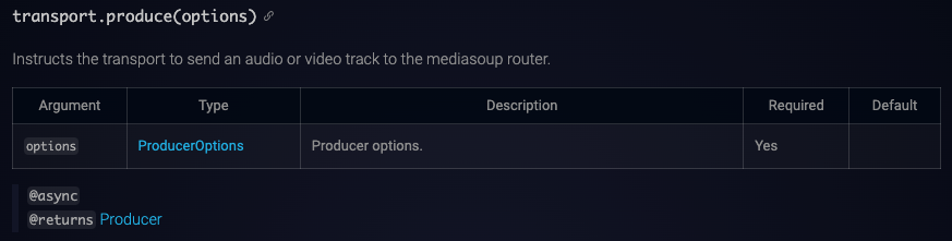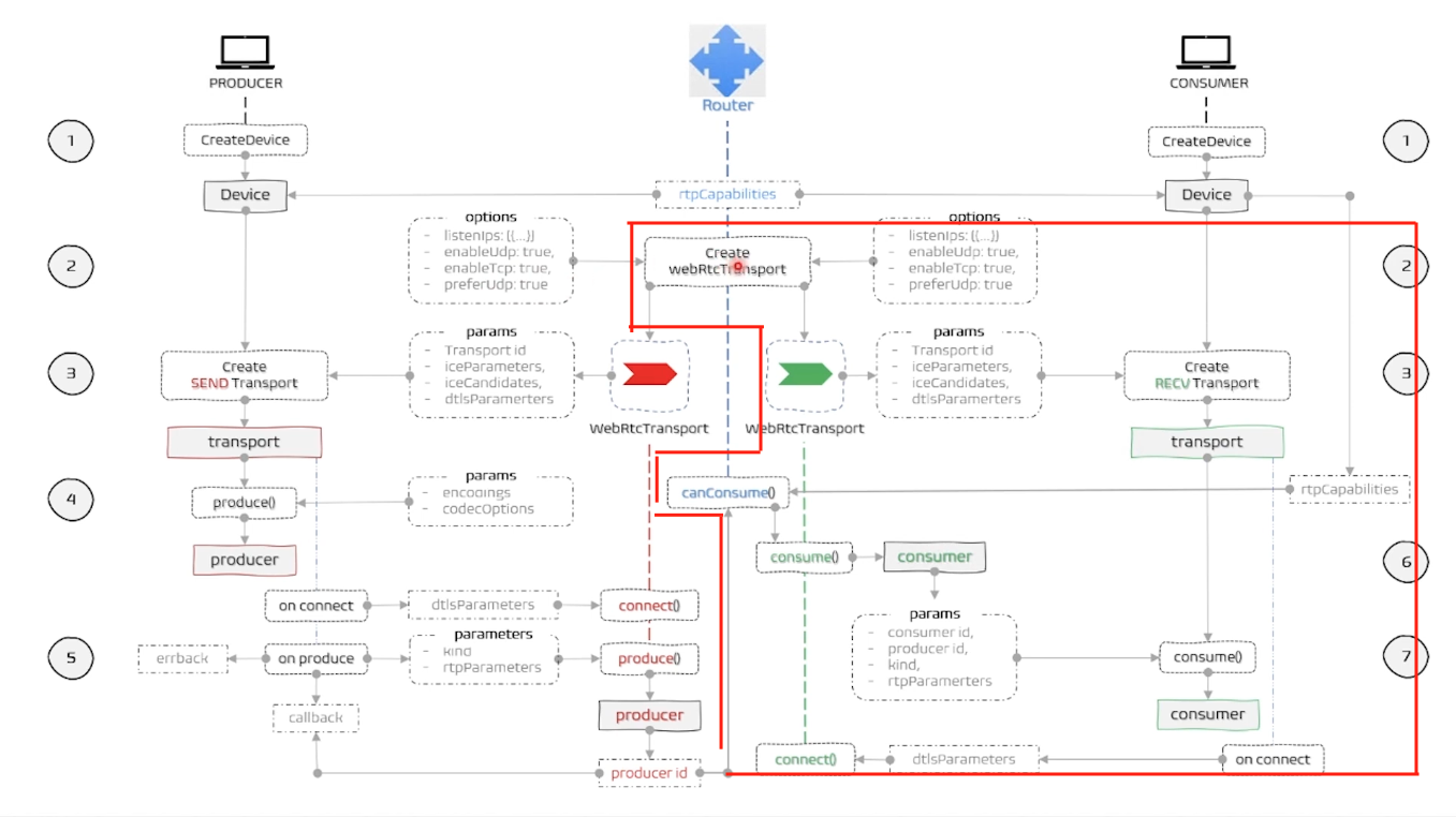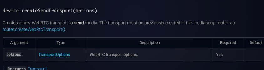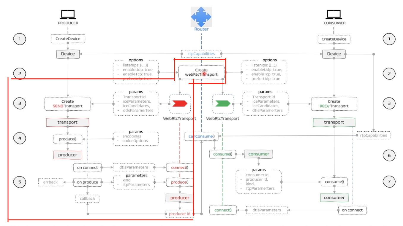 client의 transport를 생성할 때 우선적으로 라우터의 router.createWebRtcTransport() 메서드로 서버측에서 transport를 생성한 이후 클라이언트의 transport를 생성할 때 라우터의 transport 정보를 넘겨 이를 토대로 transport를 생성해야한다.