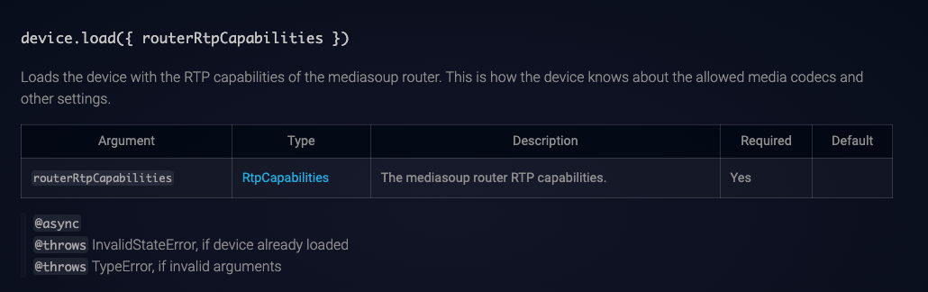 Device객체는 new Device() 메서드로 생성한 후 device.load()로 로드를 해야하는데, 이때 필요한 옵션으로는 라우터의 rtpCapabilites가 있다.