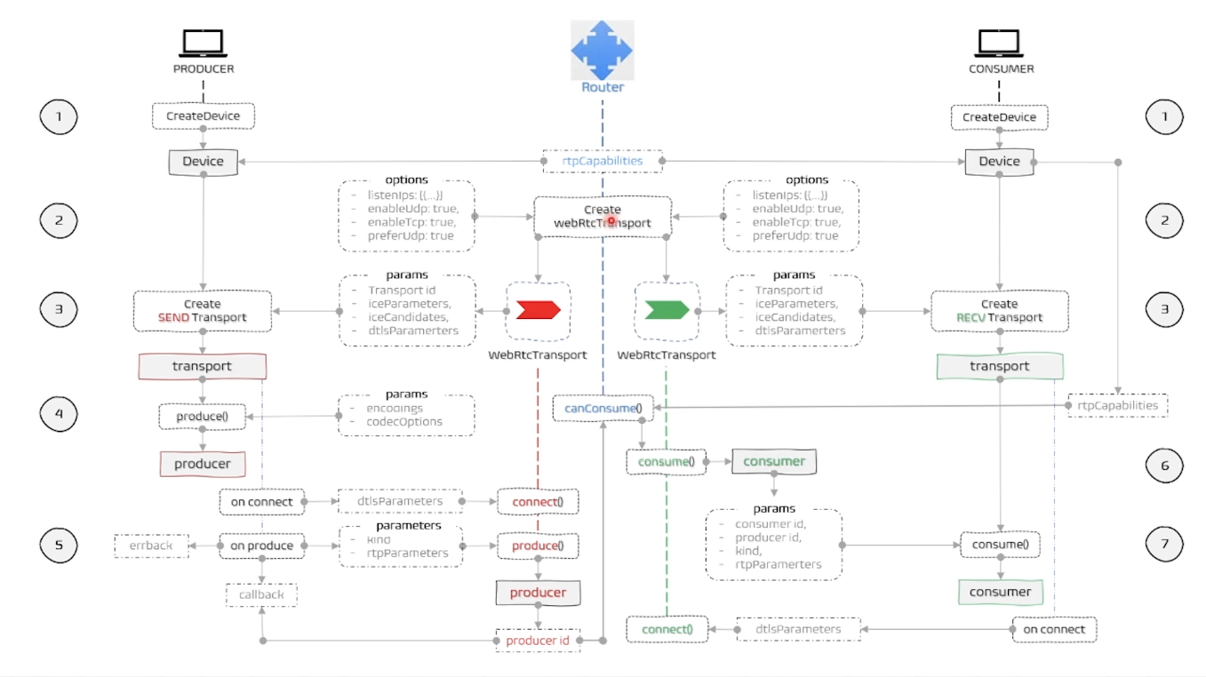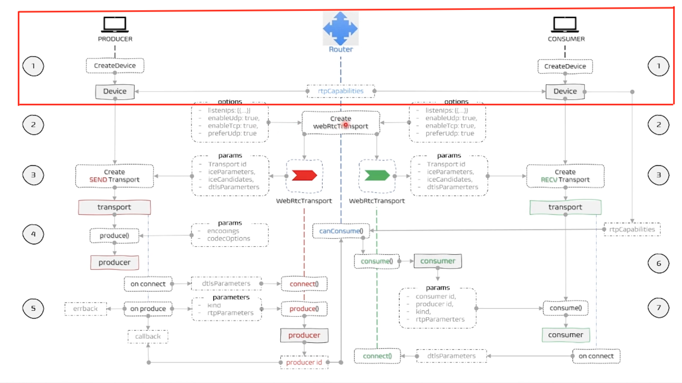 - Device는 미디어를 보내거나 받기 위해 mediasoup 라우터에 연결하는 엔드포인트이다. 즉, 클라이언트가 서버의 라우터와의 연결점이다.