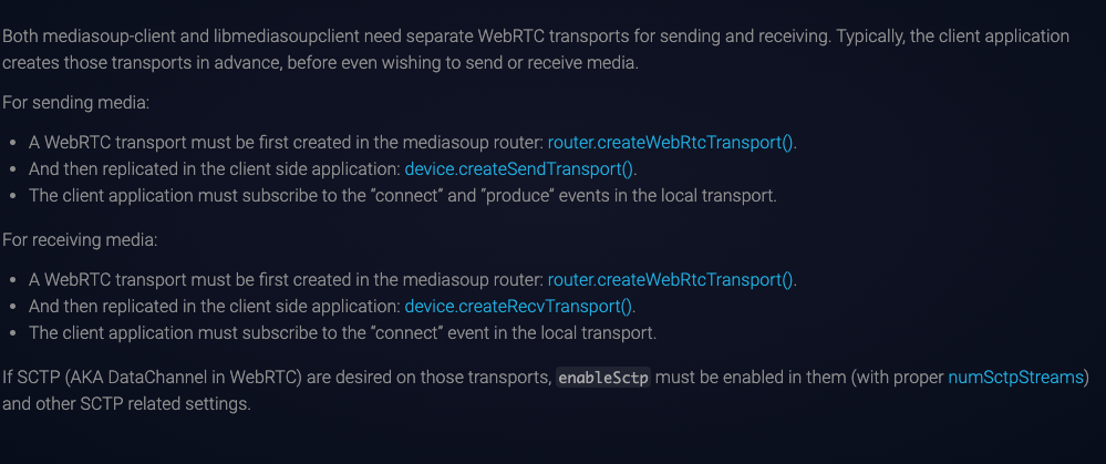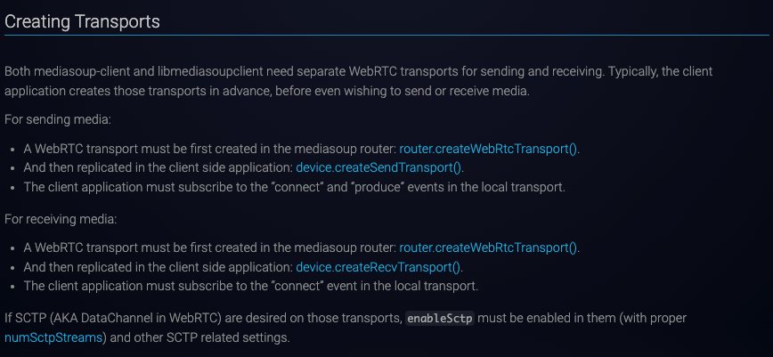 - mediasoup의 Transport는 SendTransport(보내기)와 RecvTransport(받기), 두 가지가 있다.