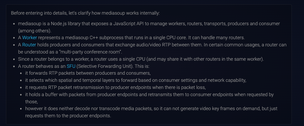 mediasoup의 공식문서가 가장 깔끔하게 정리되어있었고, 가장 최근까지 꾸준한 업데이트를 진행했었다. 또한 mediasoup의 디자인을 사진으로 한눈에 알아볼 수 있었고 mediasoup을 이용한 여러 예제들도 있었다