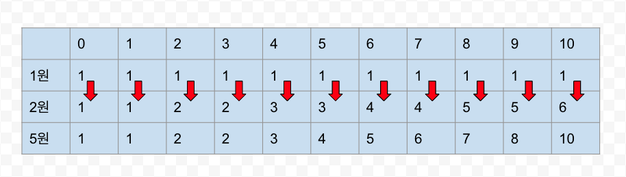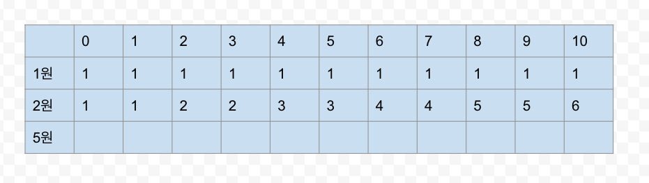 우선 1원으로 0원부터 k원(10원)을 만들 수 있는 경우의 수는 다음과 같다.