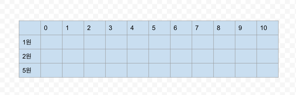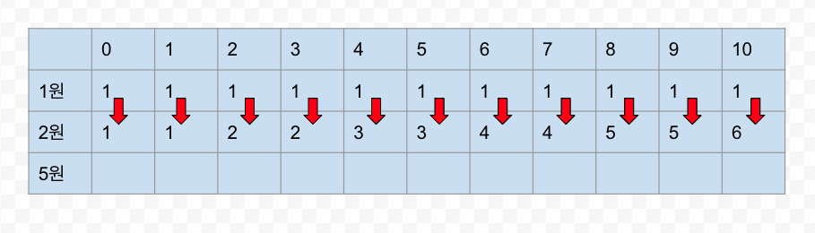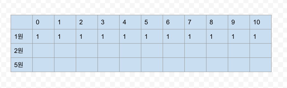 우선 1원으로 0원부터 k원(10원)을 만들 수 있는 경우의 수는 다음과 같다.