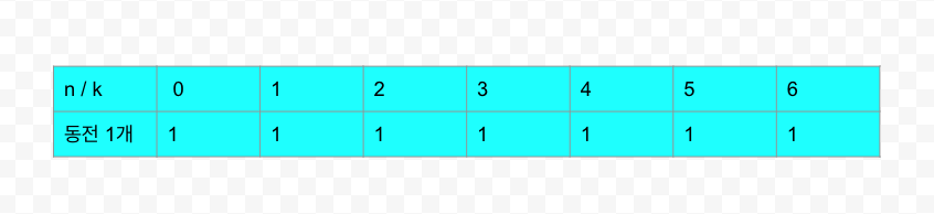 당연하게도 0원부터 6원까지의 경우의 수는 모두 1개가 된다.