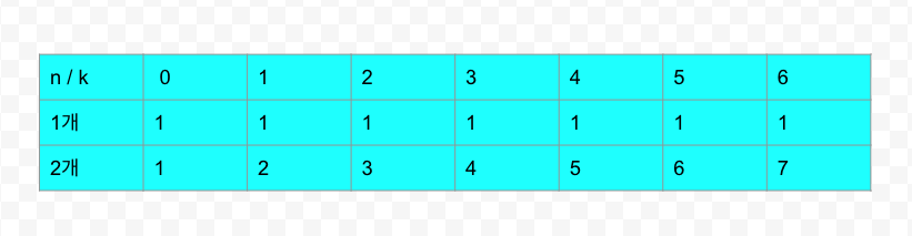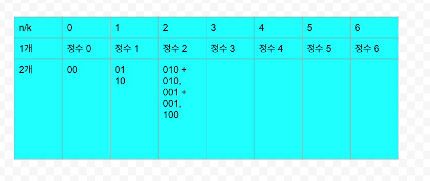 단순히 이전 결과 값에 0 또는 1을 붙임으로써 해당 k 개로 정수 n을 만들 수 있는 경우의 수가 만들어진다
