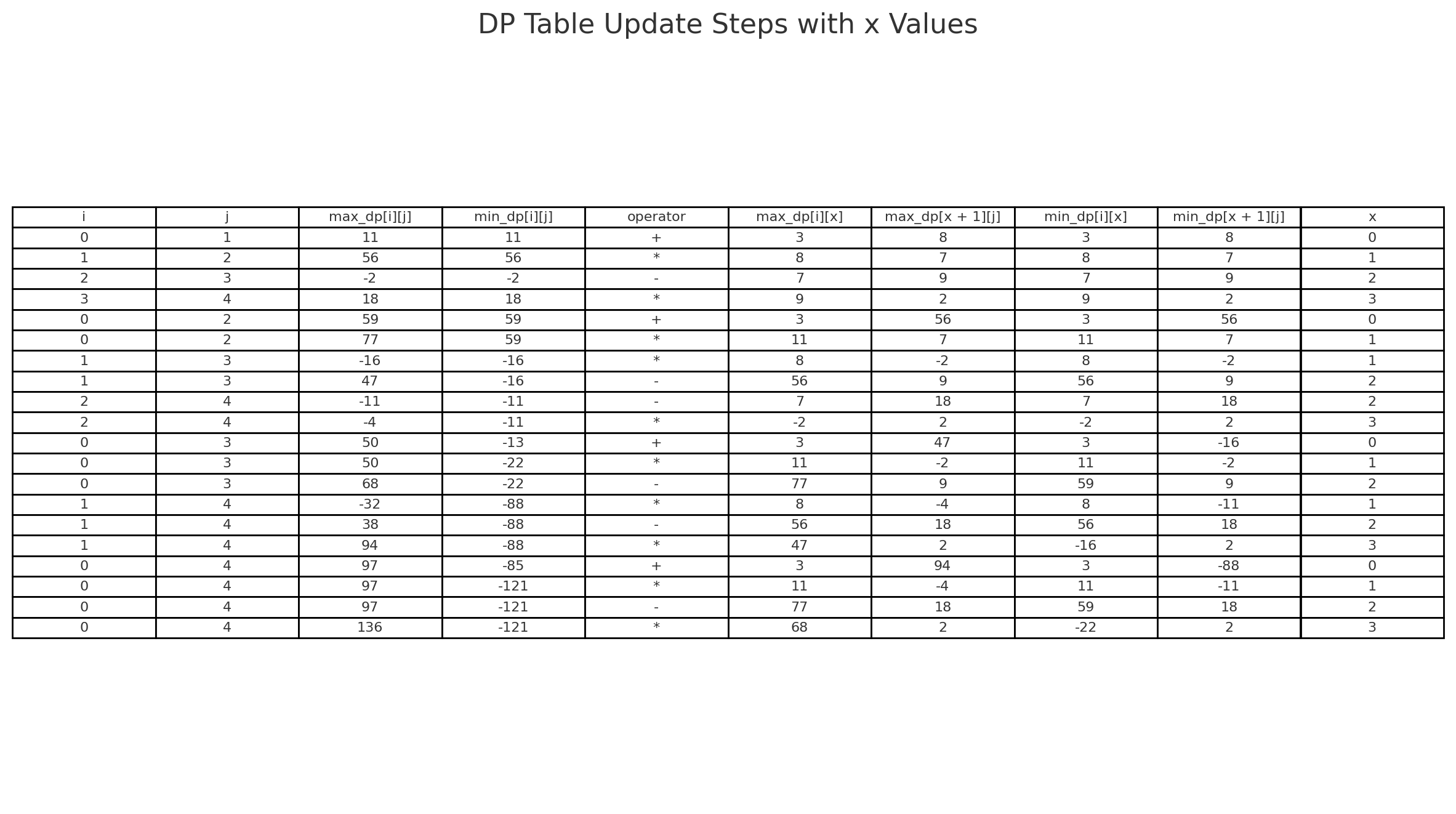 그 다음 반복문 하나하나를 보며 i,j,x,min_dp[i][j], max_dp[i][j]의 값을 보면 다음과 같다.