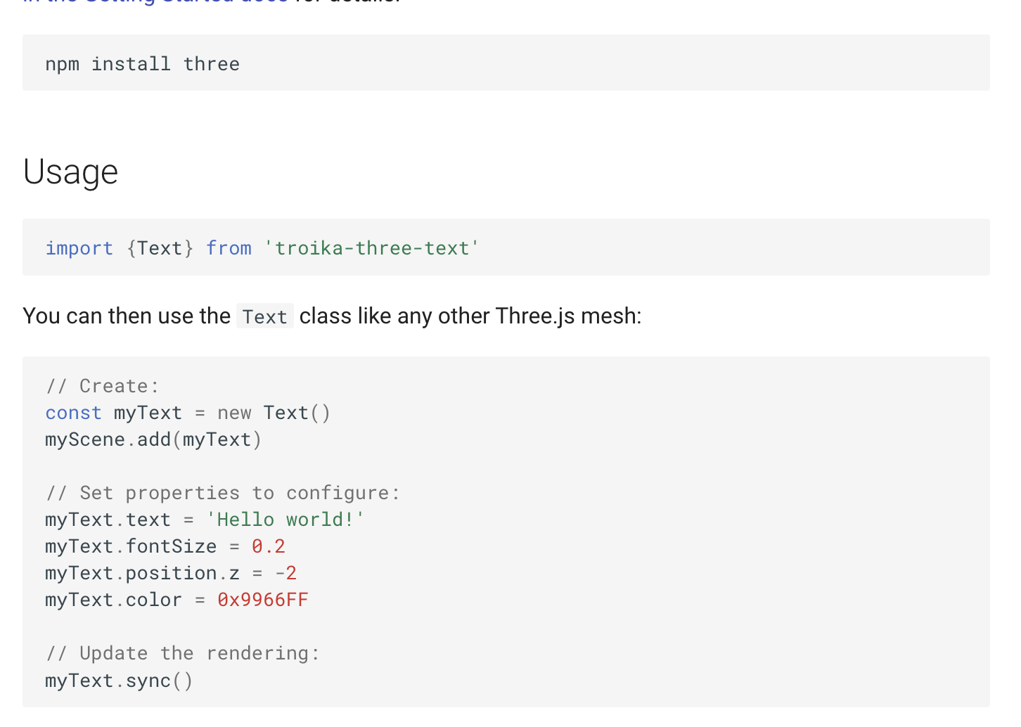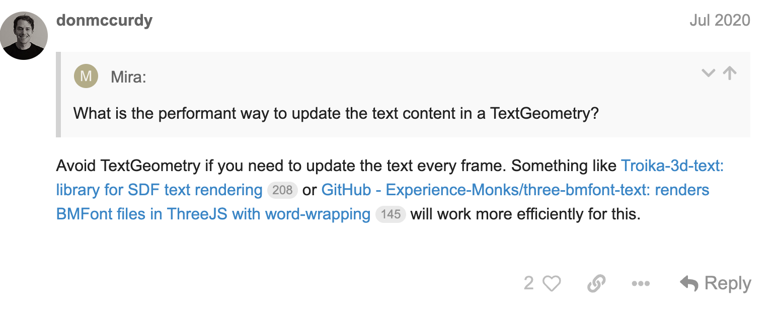 매 프레임마다 TextGeometry를 업데이트하는 것을 피하고, "Troika-three-text"와 같은 threejs와 연계될 수 있는 외부 라이브러리를 사용하는 것을 권장한다 합니다.