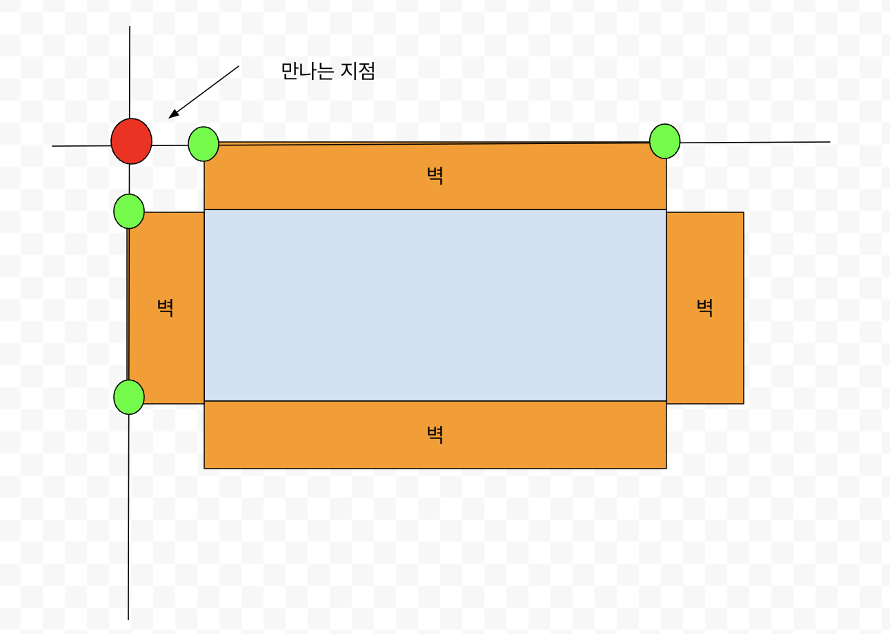 최종적으로 x의 값은 x = (b2 * c1 - b1 * c2) / determinant가 됩니다. 이를 통해 계산된교차점 좌표로 새 벽을 생성합니다.