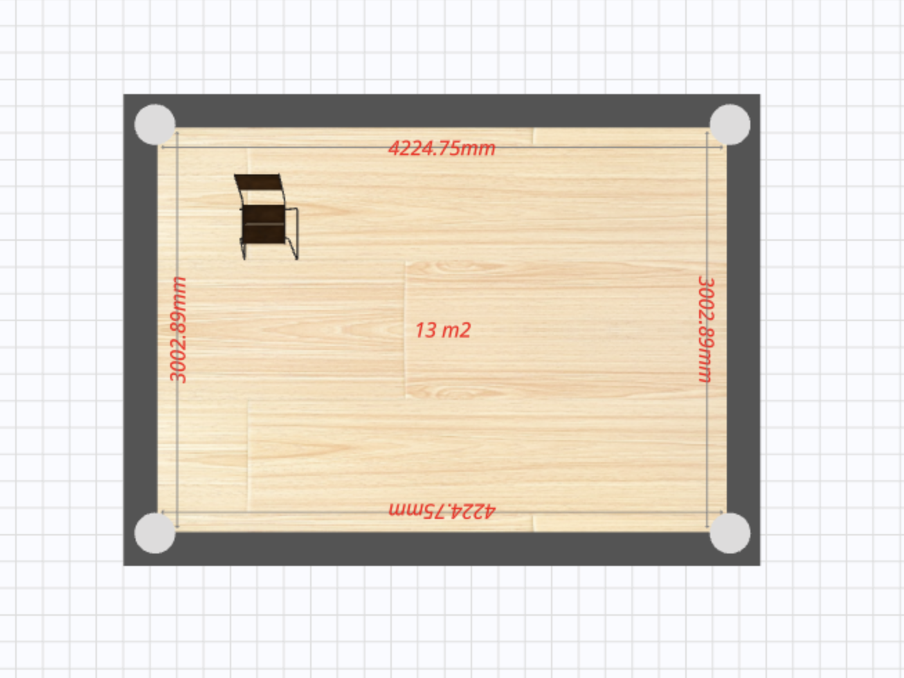 방의 생성은 사용자가 누른 지점부터 다시 한번 더 사용자가 누른 지점까지의 영역입니다. 그 영역을 바닥으로 채워 사용자가 한 눈에 알아보기 쉽도록 합니다. 사진상의 우드(wood)스타일의 영역이 바로 바닥입니다.