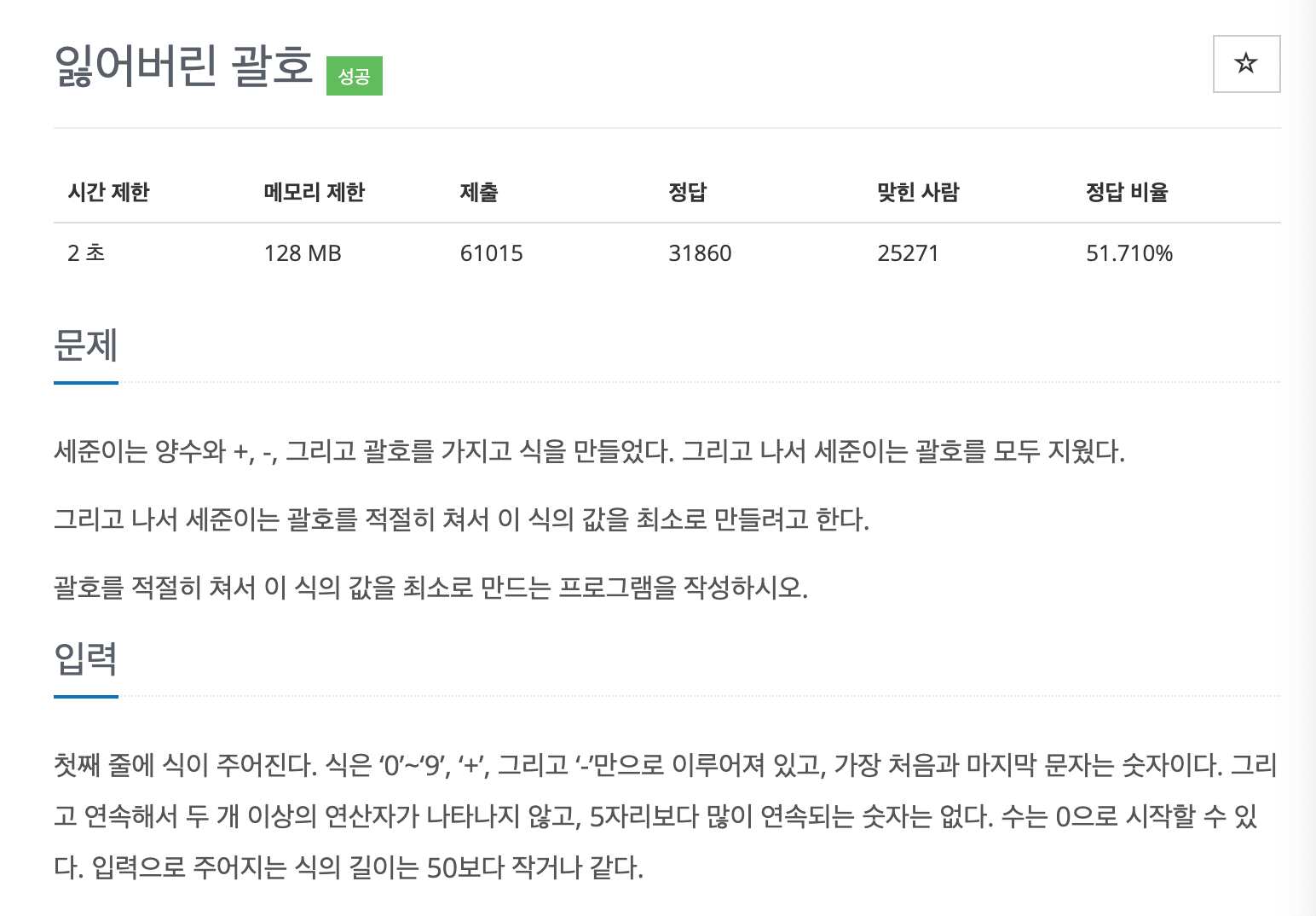첫째 줄에 식이 주어진다. 식은 ‘0’~‘9’, ‘+’, 그리고 ‘-’만으로 이루어져 있고, 가장 처음과 마지막 문자는 숫자이다. 그리고 연속해서 두 개 이상의 연산자가 나타나지 않고, 5자리보다