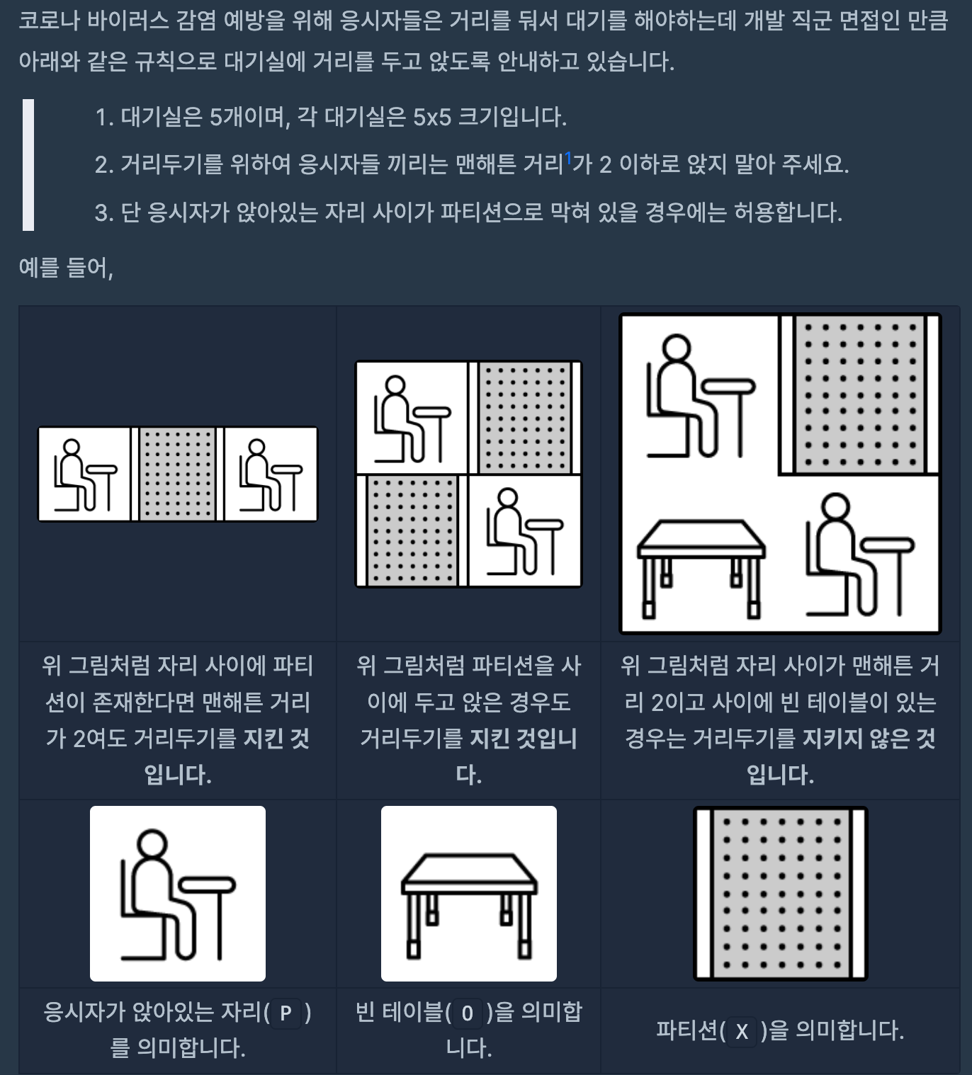 쉽게 말하면, 2차원 배열 안에 P를 기준으로 거리가 2 이내에 다른 P가 있는지, 있다면 그 사이에 X가 있는지, O가 있는지 판별하는 문제이다.
