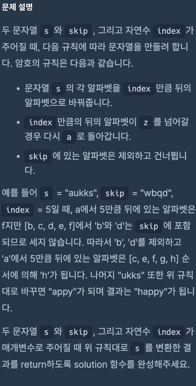 또한 while문을 사용한 이유는 skip의 문자가 알파벳 순서라면, 즉 skip = 'abcd'라면 abcd 모두를 건너뛰어야 하기 때문에 while문을 사용했다.