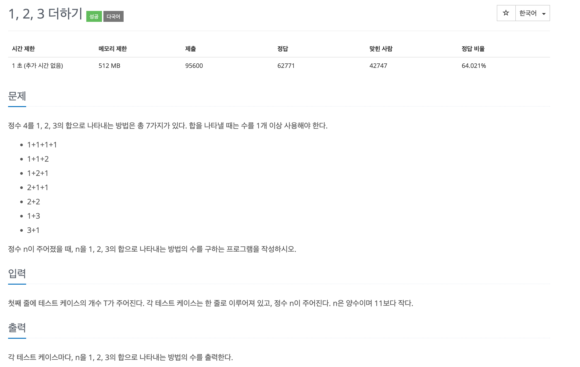 각 테스트 케이스마다, n을 1, 2, 3의 합으로 나타내는 방법의 수를 출력한다.