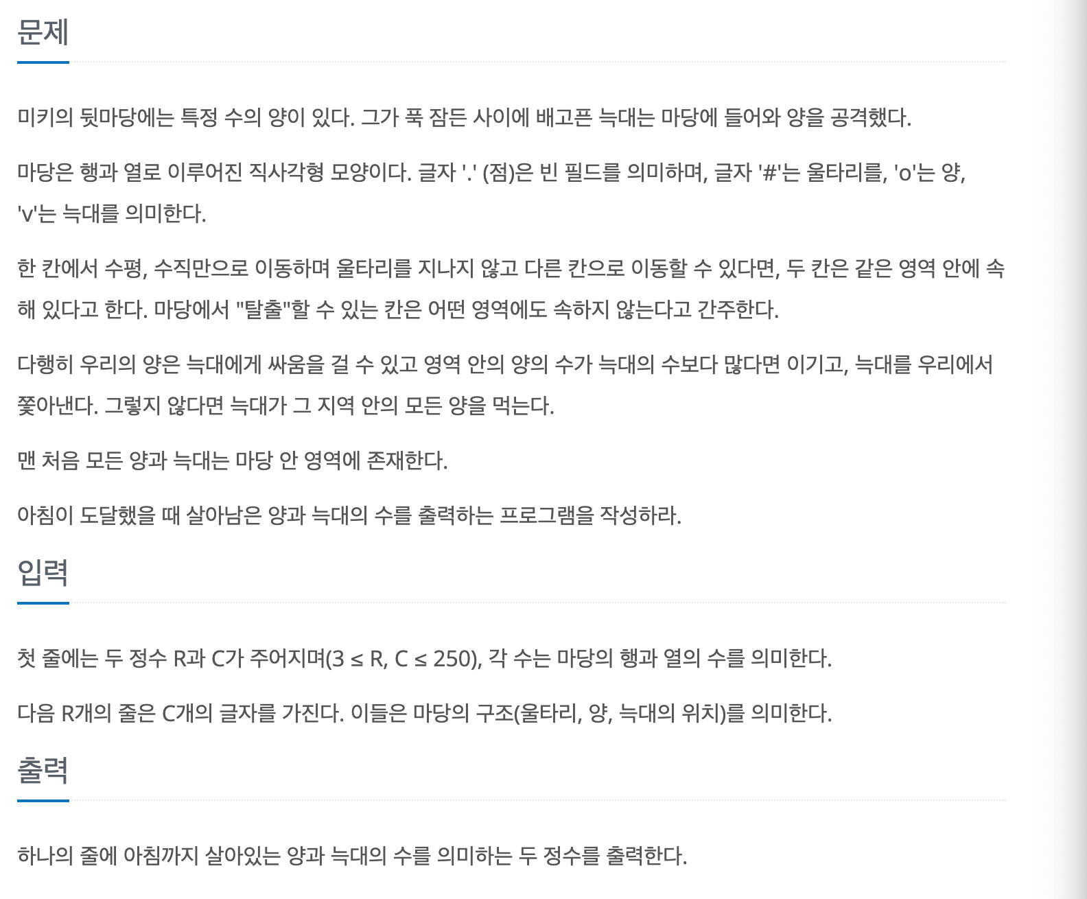 첫 줄에는 두 정수 R과 C가 주어지며(3 ≤ R, C ≤ 250), 각 수는 마당의 행과 열의 수를 의미한다. 다음 R개의 줄은 C개의 글자를 가진다. 이들은 마당의 구조(울타리, 양, 늑대의 위치)를 의미한다.